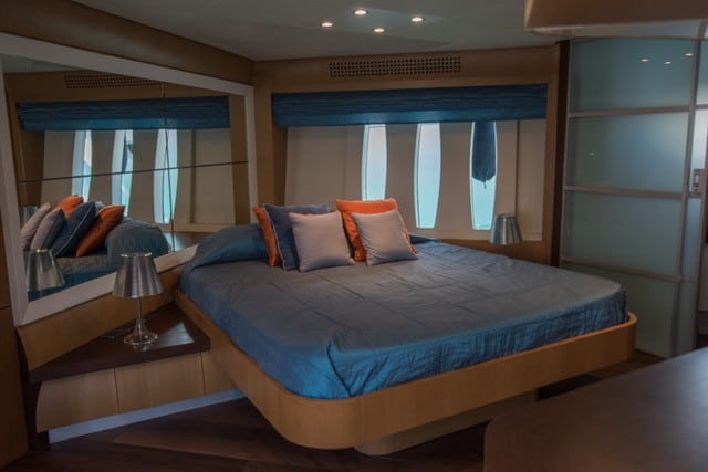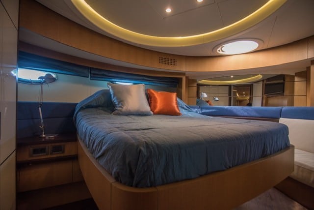 Modern and elegant, she can accommodate up to 8 people in 4 cabins, including a spacious amidships Master cabin with King size bed, providing comfort and style with a dressing room, bathroom with shower and the latest in audio and visual equipment. and air conditioning. The VIP cabin is located towards the bow and has a bathroom with shower and Queen size bed, air conditioning. There are two twin cabins located in the center of the ship, both with two single beds, bathroom with shower and A/C. In the aft part there is the crew cabin with independent access to give more privacy to the guests, and the kitchen.
