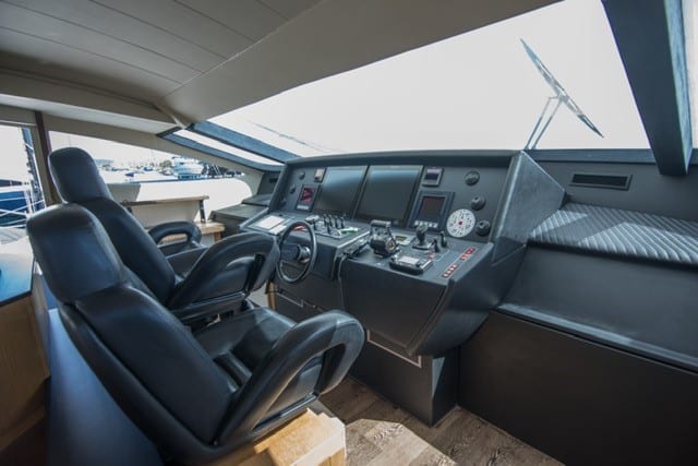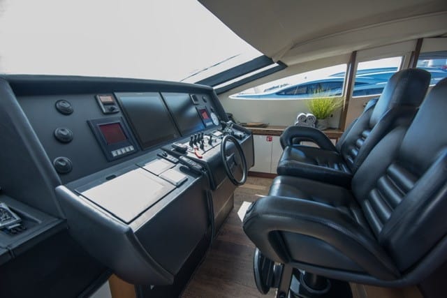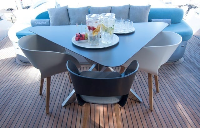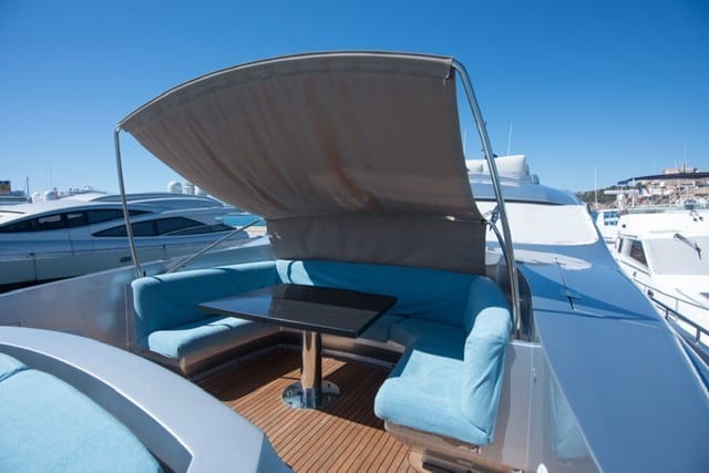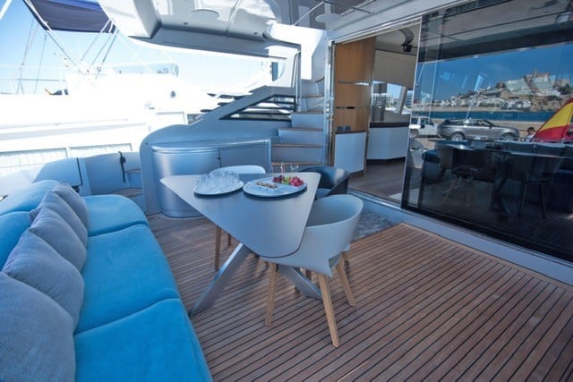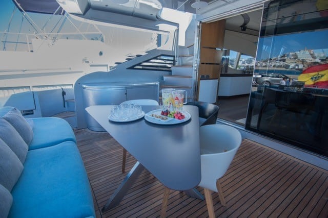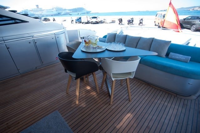 Charter Yacht Pershing 90 in Marina Botafoch “Inspiration” offers fantastic deck space. The exterior design gives the boat an aggressive and very sporty touch. Inside however, peace and calm reign, especially in the harmonious design and innovative solutions in terms of space.