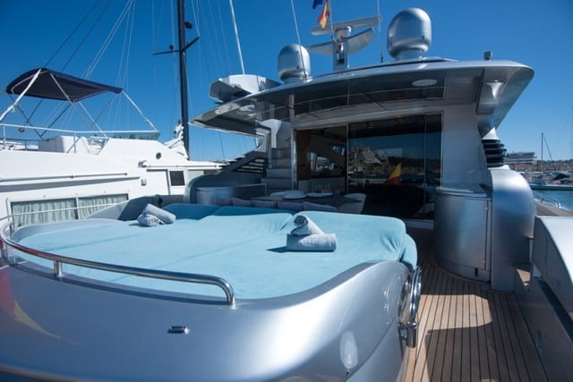 Pershing 90 in Marina Botafoch, a 28 meter long superyacht, is defined by its sporty, aggressive lines and its speed. She reaches a maximum speed of 45 knots and cruise of 38. A slim and aerodynamic profile with a magnificent and sporty hull in a shiny metallic silver color that makes her stand out from any boat. She can accommodate 8 people in 4 cabins at night, and 12 during the day plus crew. The deck, consisting of a dining room, a large flybridge and several solariums, is the ideal space to relax, sunbathe and socialize with family and friends. On board, she will have exceptional captain, deckhand and deckhand service, and multiple toys to ensure an authentic luxury charter experience.