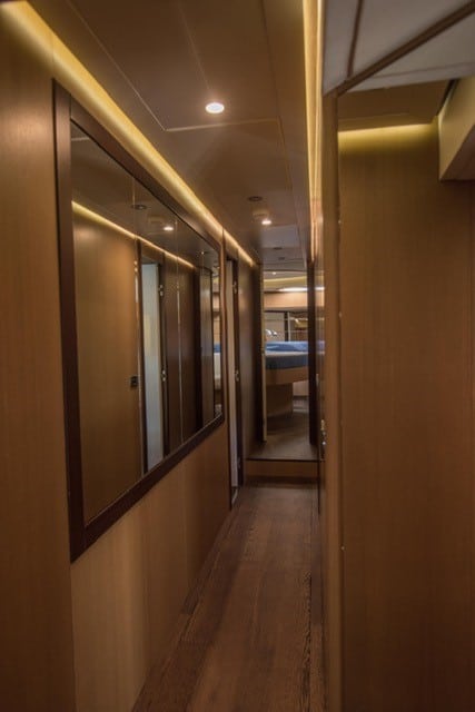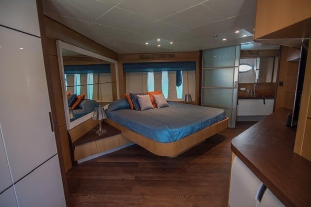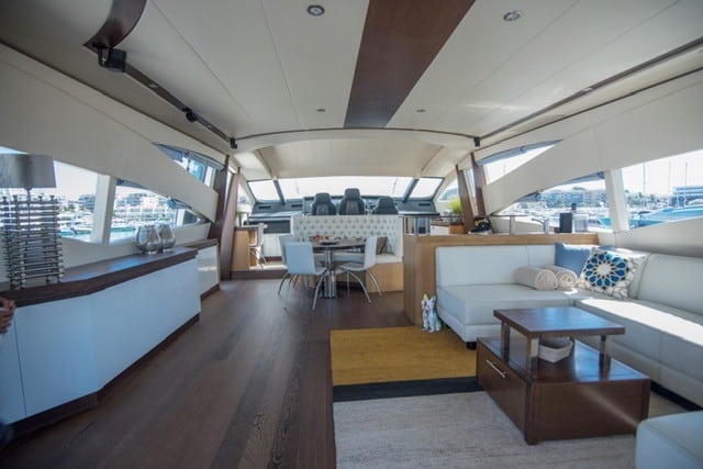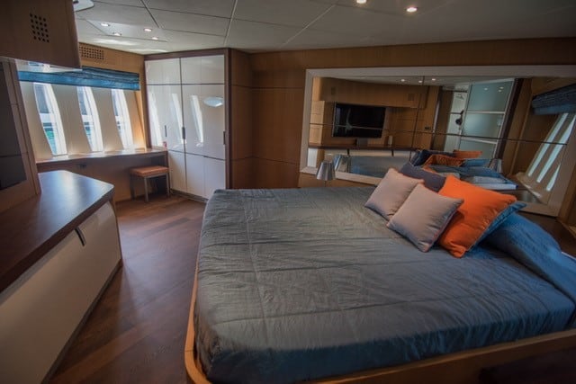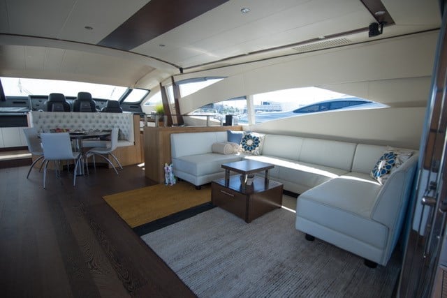 This Pershing 90 luxury super-yacht for rent in Ibiza offers a modern and comfortable interior, the lounge and dining room are open plan and feature medium dark wood floors and furniture in soft warm wood combined with white, light fabrics and upholstery and with color to create a positive and dynamic environment.