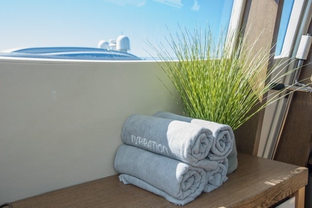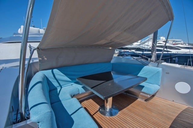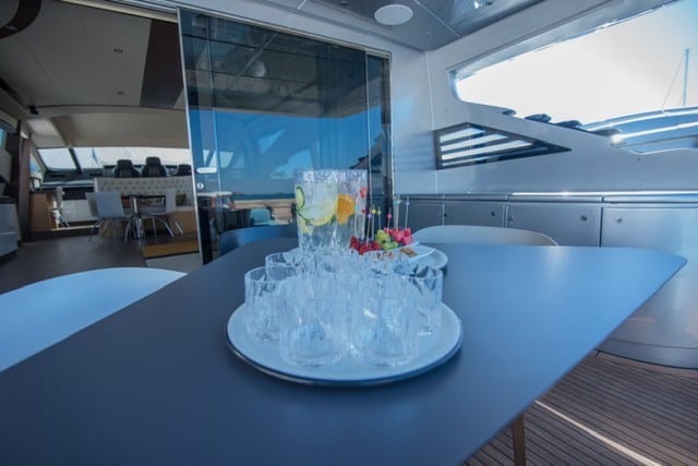 The aft deck is large, with an outdoor dining option and a large sun bed. The extended bathing platform is ideal for water sports. Above the main deck, the flybridge also has another sunbathing solarium with a large bed and two comfortable hammocks. In the bow you will also find another large mat for sunbathing and an additional option for lunch, dinner, breakfast or a cocktail outdoors with a sofa area, dinette table, awning and more privacy.
