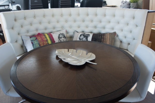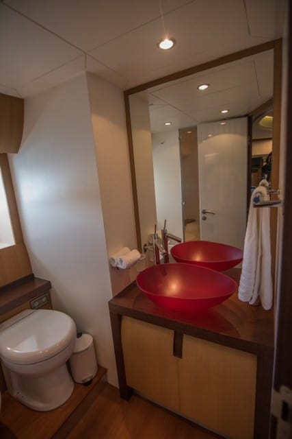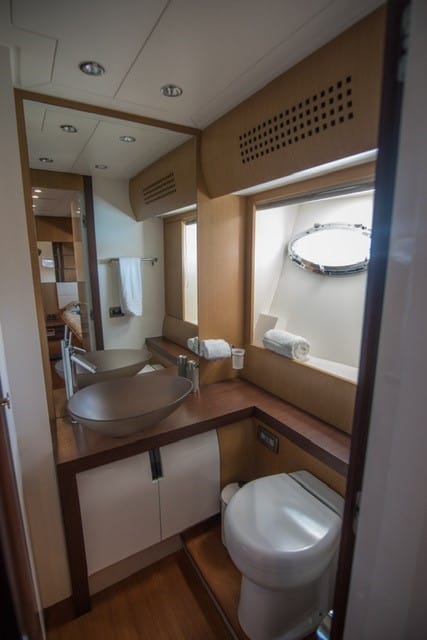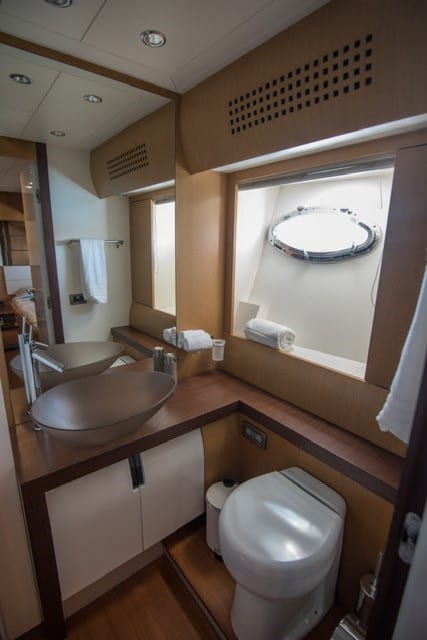 The interior design offers a modern, although not minimalist, style and optimizes the use of space. The main saloon is well appointed with ample areas to lounge and relax with family and friends. Why not enjoy a movie night on the boat? The living room also has a dining area with a large table and space for indoor dining.